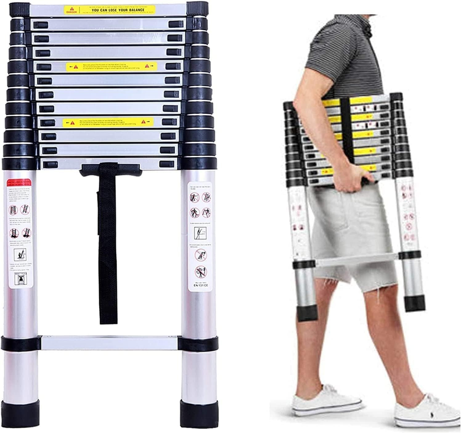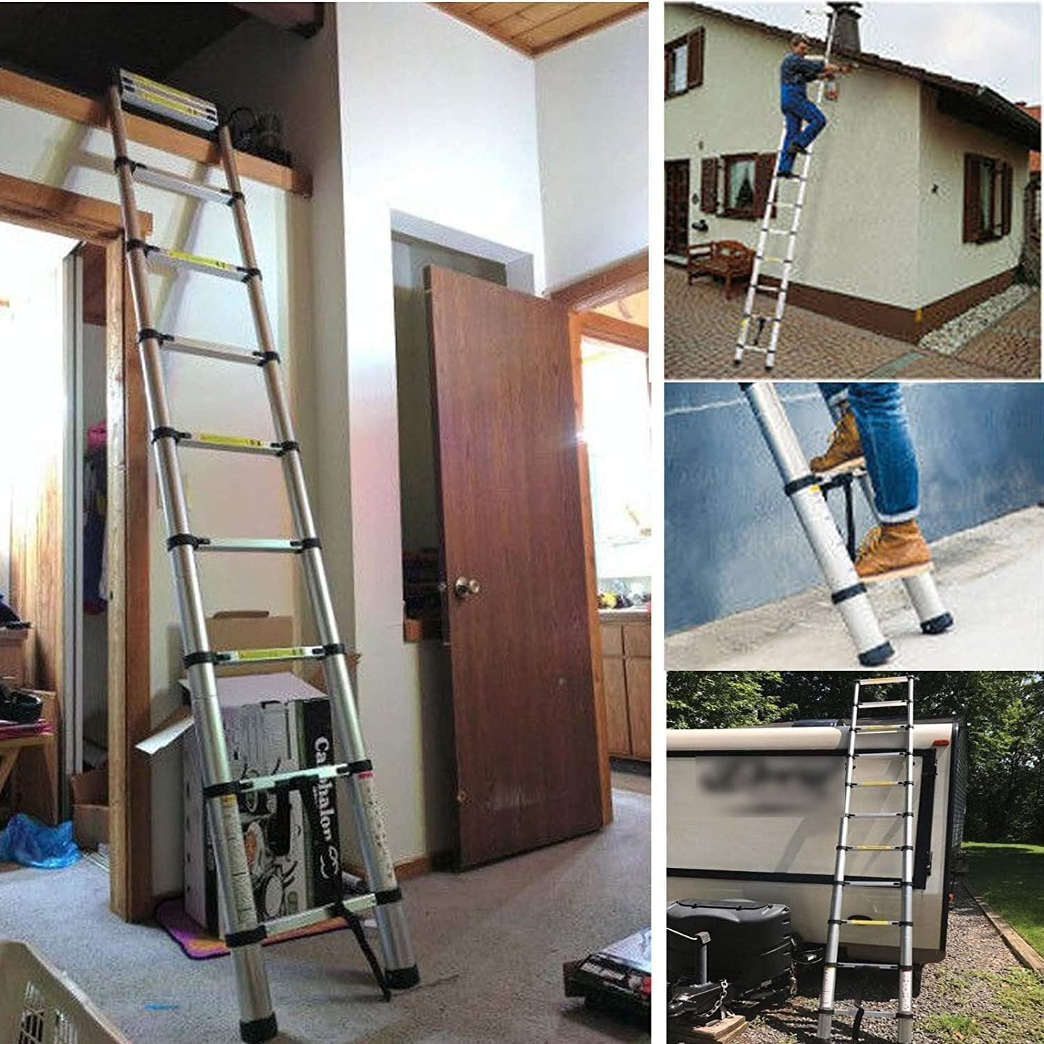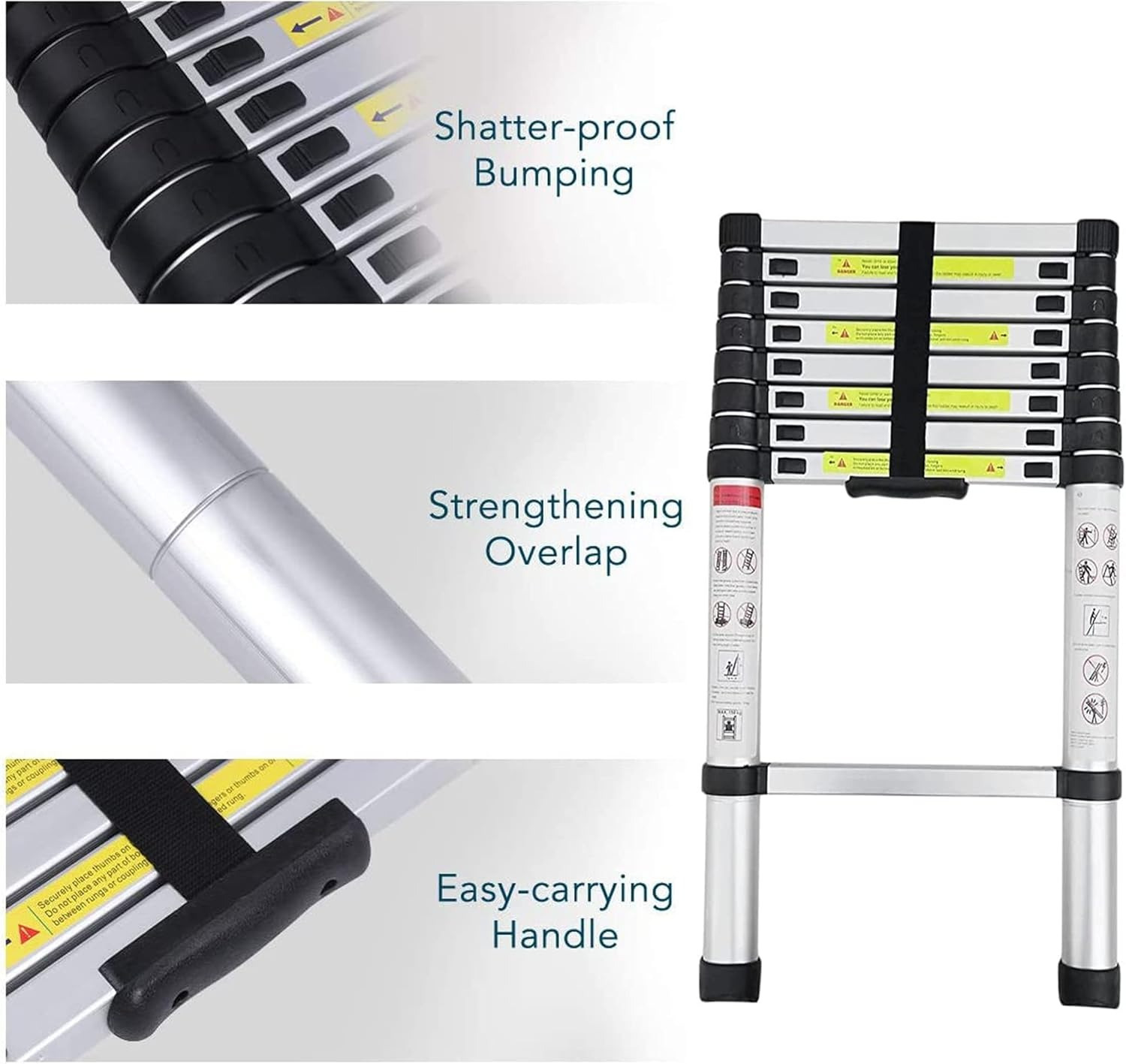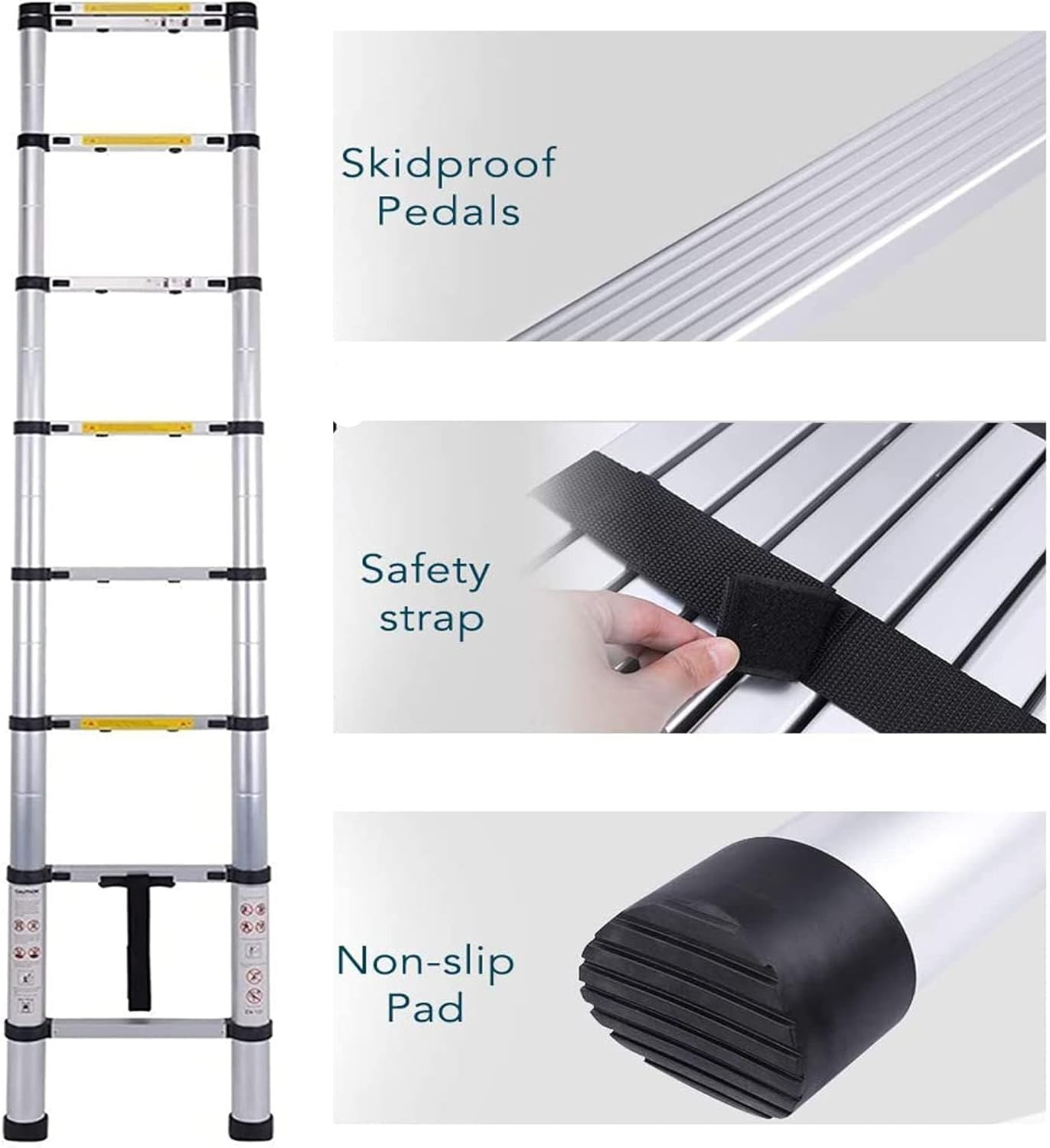 · ▶Safe and Strong: The ladder is made of high quality aluminum, industrial-grade locking latches and solid anti-slip rubber feet. The telescopic ladder is approved by safety standard EN131. Maximum load capacity: 330 lbs(150Kg).