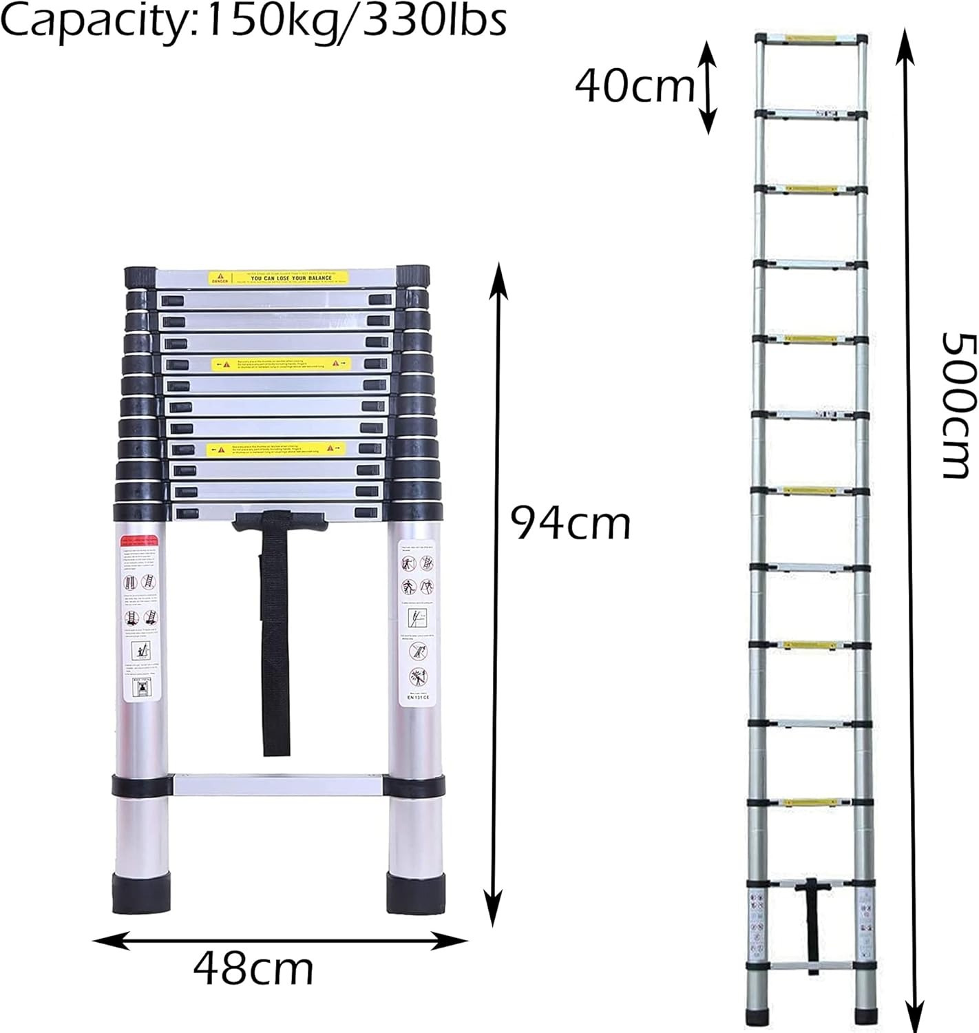 5m/16.4ft Telescopic Straight Ladder Extendable Folding 13 Steps Multipurpose Ladder Extension Fantastic ladder, portable and lightweight, telescoping and folding, easy to carry, great for Home Office Warehouse Building Archives Kitchen Garden Library Bookstore Bookshop Window Washing Cleaning Job Home Building Maintenance Decorating Printing Party Decorating Use. Features: ◆ Premium aluminum material makes our ladder durable ◆ Multi-purpose design ◆ Extendable and collapsible design ◆ Ladder locks increase the stability and safety ◆ Lightweight and easy to carry with storage straps ◆ Space-saver and no need to install ◆ Non-slip mat and rubber feet ◆ 150kg/330lb load-bearing capacity ◆ Adaptive and can be applied indoor and outdoor Specification: Type:Telescopic ladder Structure: Single straight ladder Material: Aluminum Anodized Finish Rungs: 13 steps Step Interval: 40cm/15.7inch Height(totally extendable): 5m/16.4ft/197inch Height(totally folding): 98cm/3.2ft/38.6inch Length(side to side): 48cm/18.9inch Width(front to back): 8.5cm/3.3inch G.W.: 13.3kg/29.3lb Max. Load: 150kg/330lb Packages include: 1x Telescopic ladder 1x Manual Note: Slight deviation may occur during measurement, please take care and thanks for your understanding.