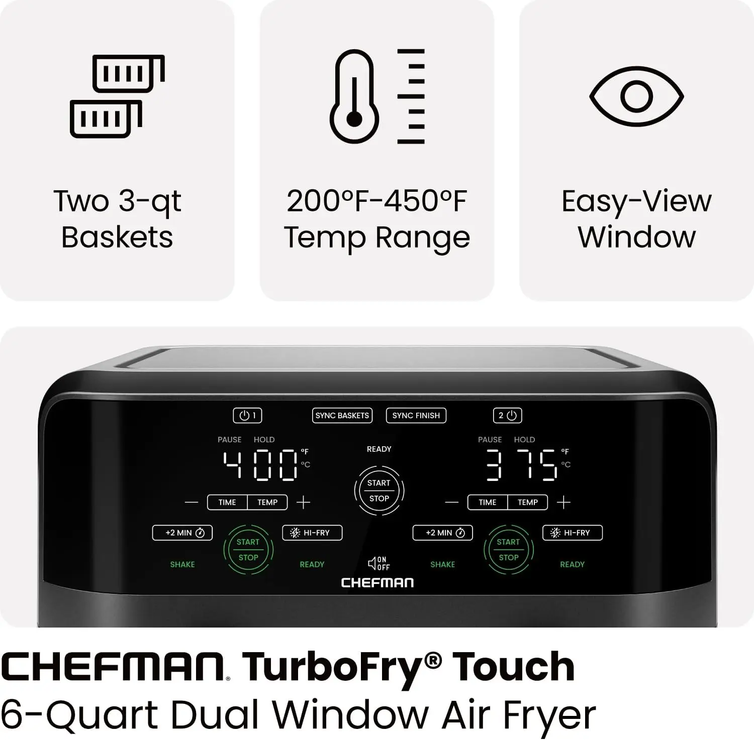 - WIDE TEMPERATURE RANGE: Digital air fryer dual basket temperature settings from 200-450°F allow you to cook at low and high heat for food just the way you want it.