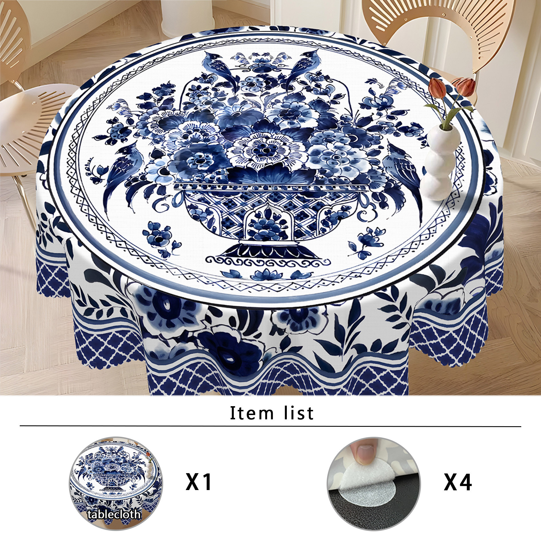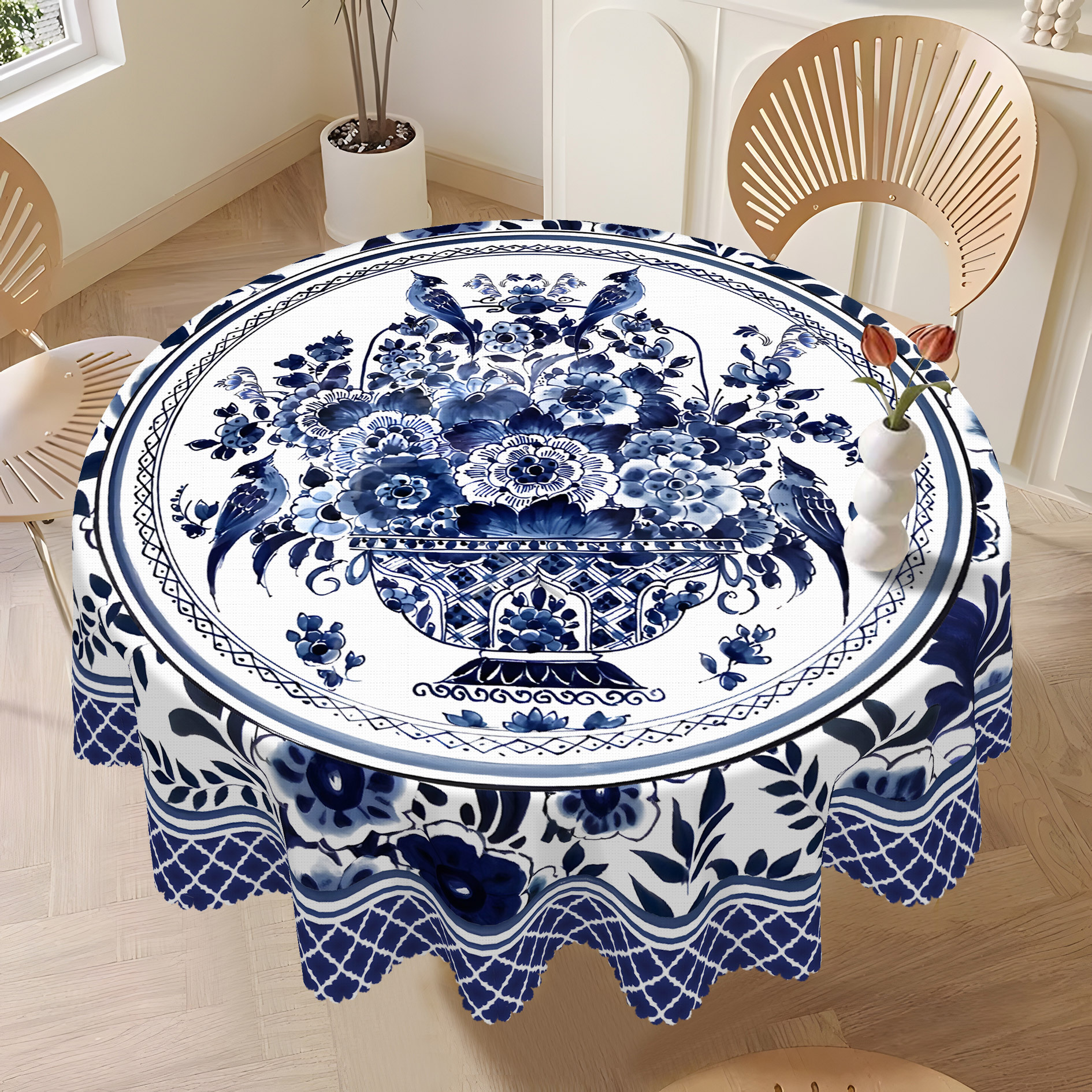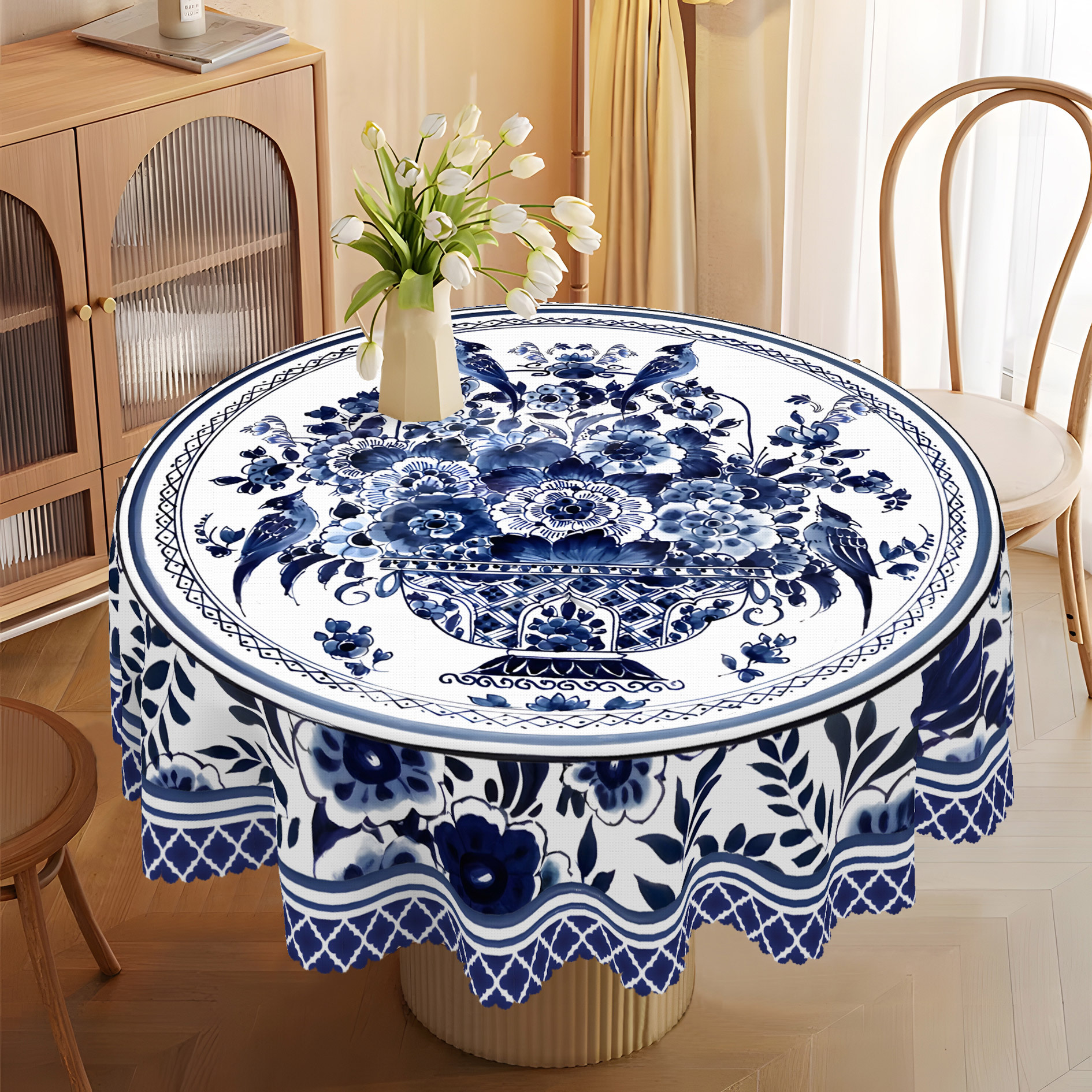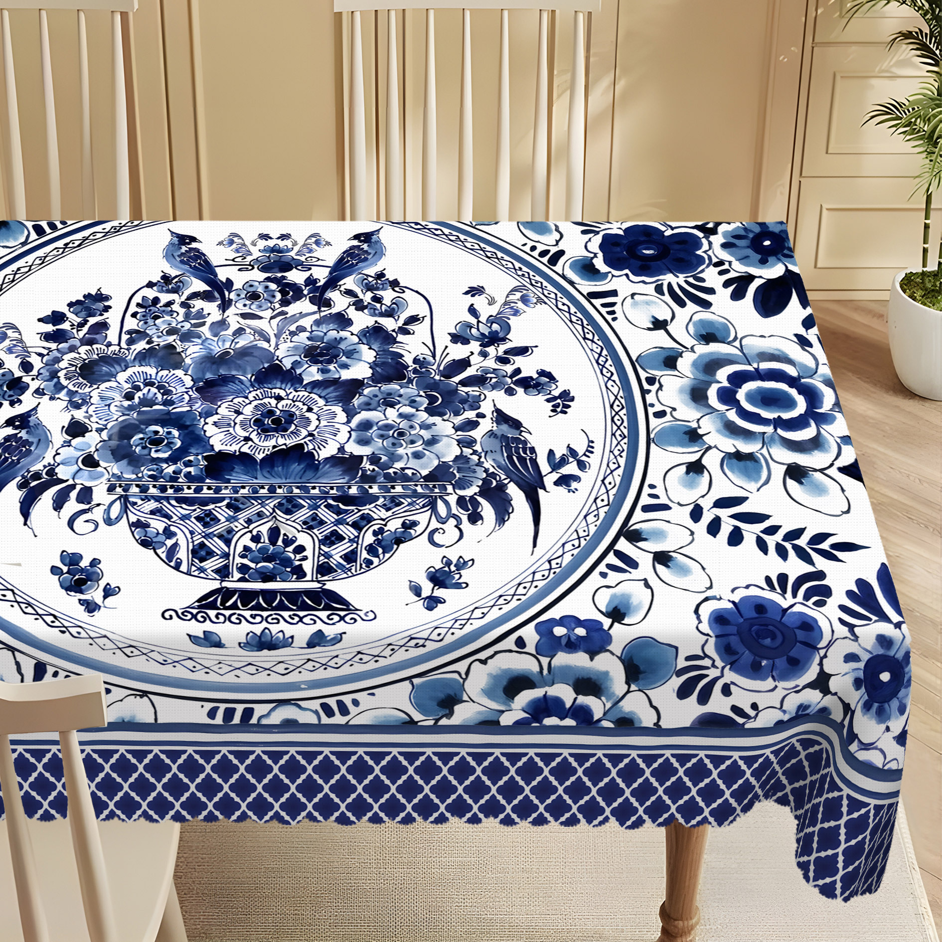 Elegant Blue & White Floral Tablecloth - Traditional Chinese Ceramic Design, Int