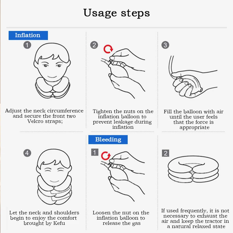 Product maintenance instructions: Spot cleaningFeature1.Triple anti leakage designEasy to use, you can use it while working or resting2.Portable adjustable neck traction pillow3.This product is made of comfortable flocking fabric, which is very skin friendly and soft